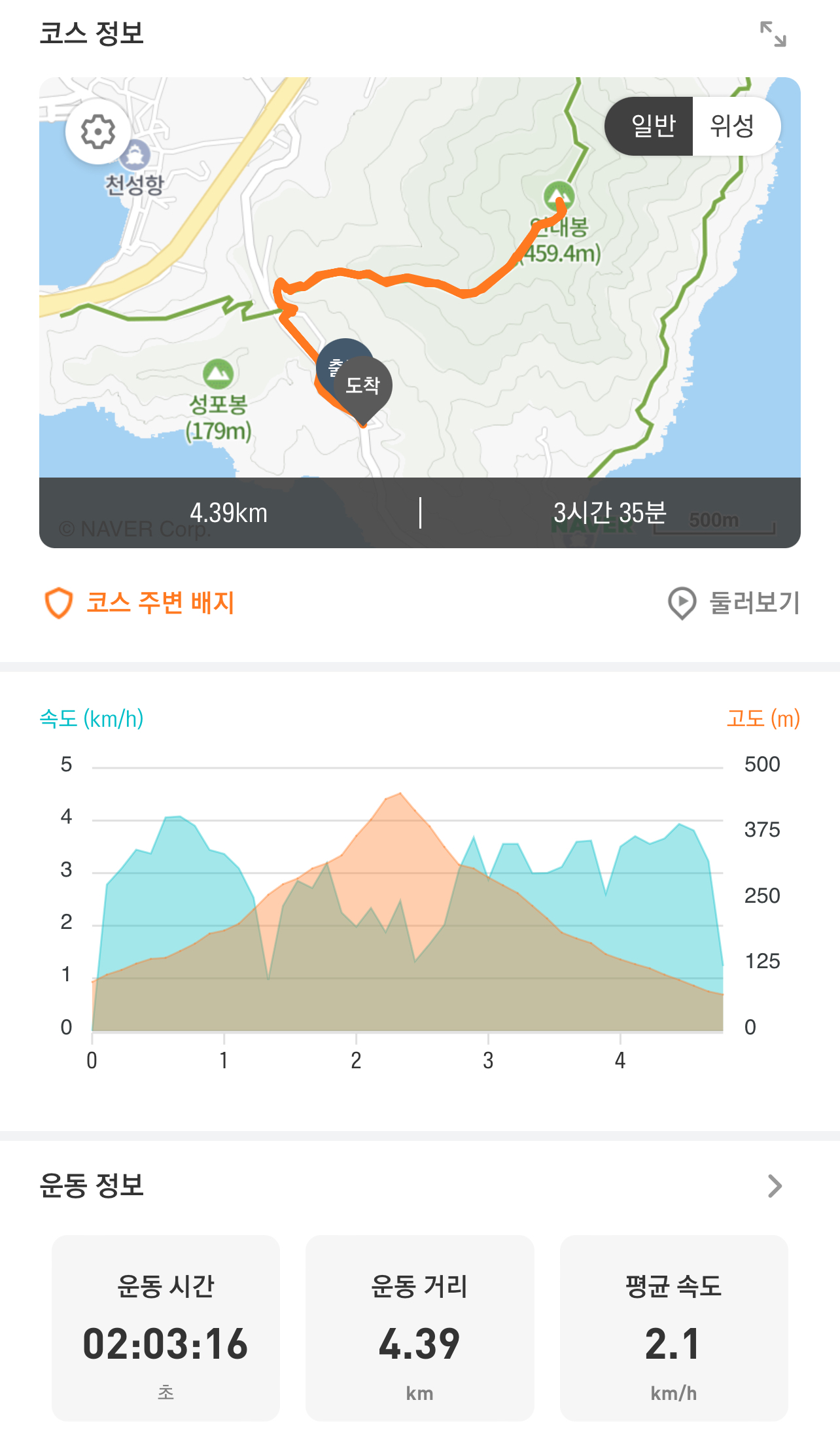 오늘의 코스와 시간 정보.