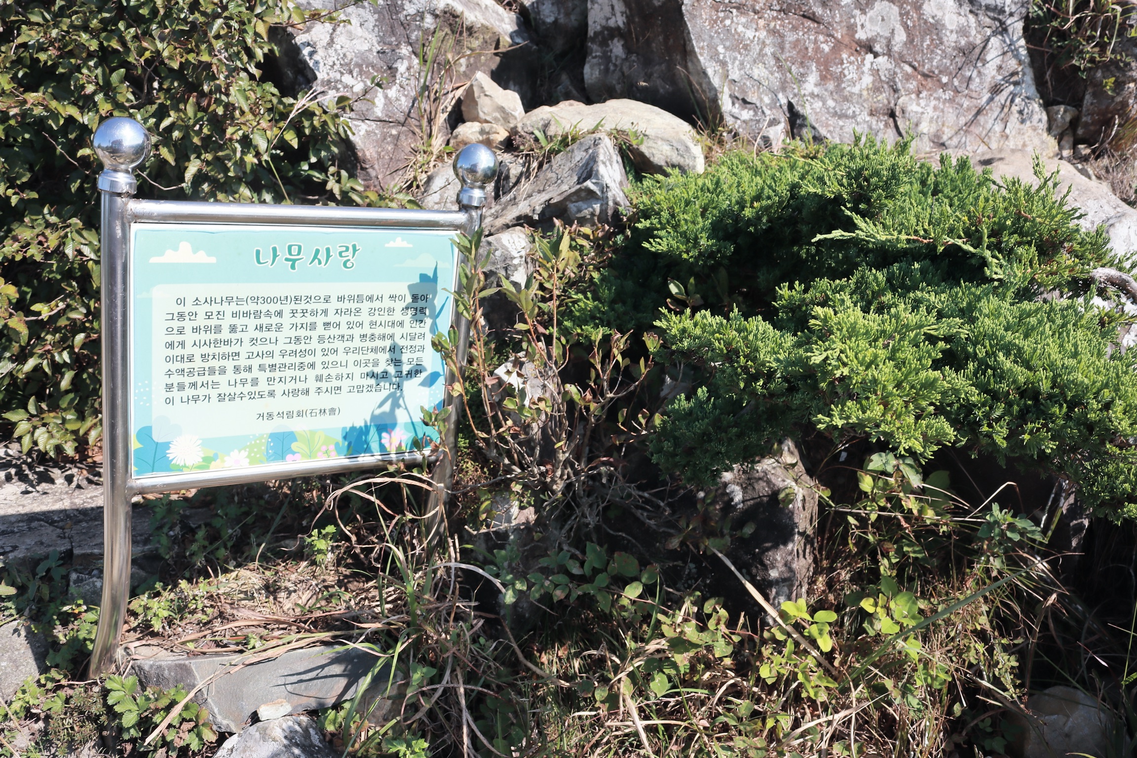 정상석 밑에 있는 소나무인데 약 300년 된 것으로 추정되는 나무인데 이미 위쪽은 훼손이 좀 되어 있다.