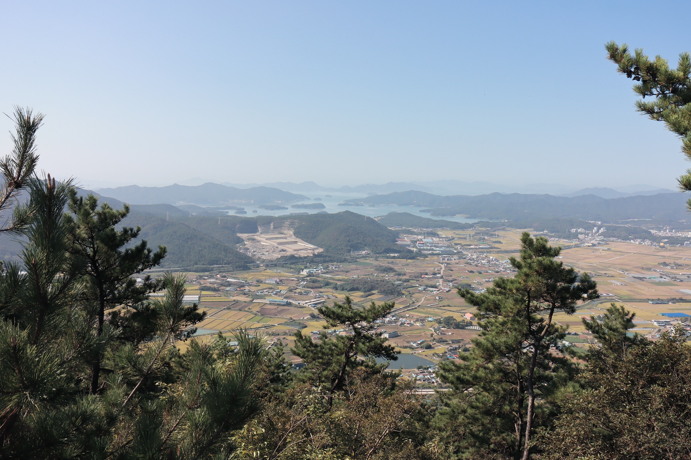 한쪽은 바다가 보이고 반대쪽은 가을 논들이 보인다.