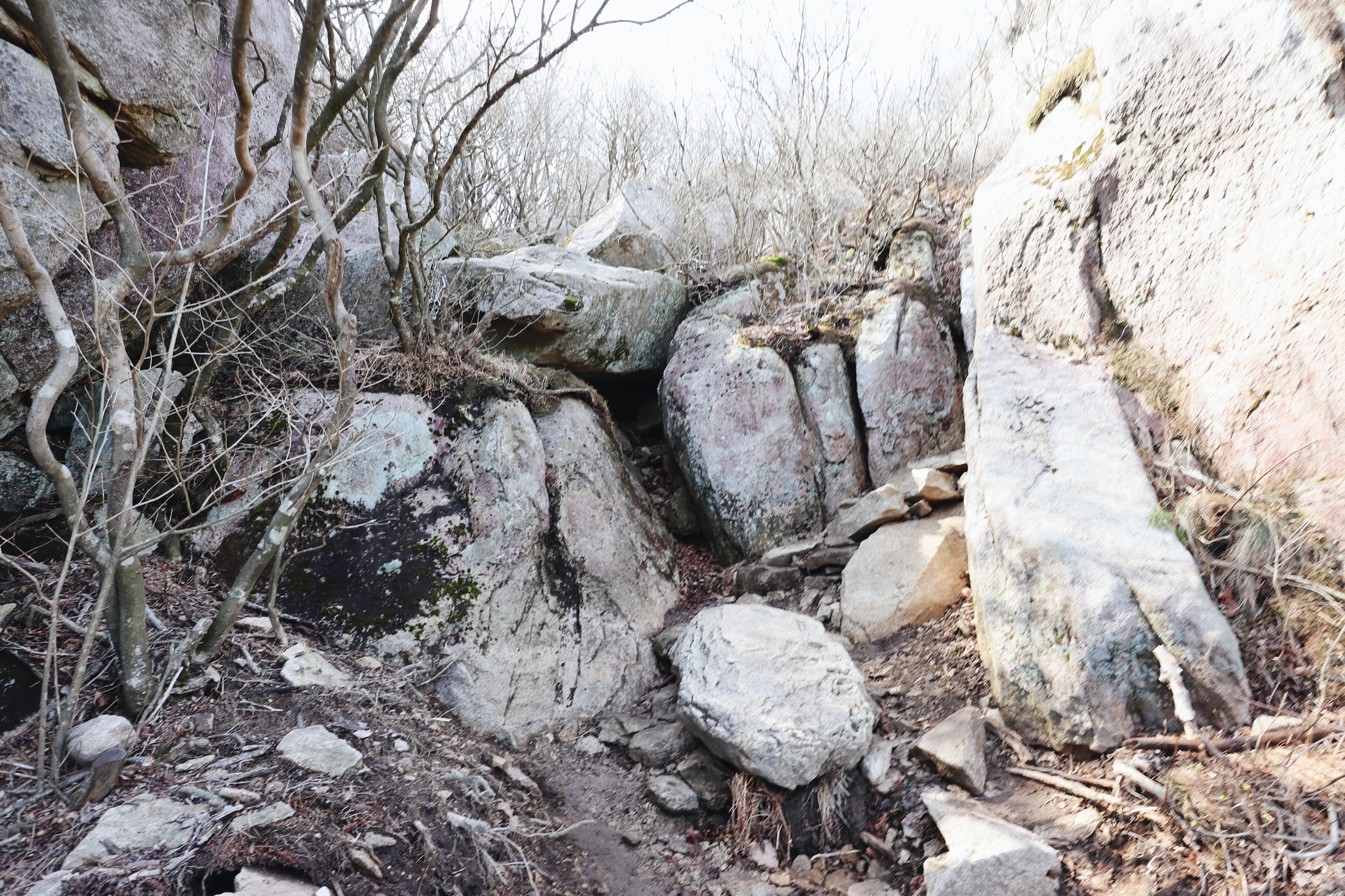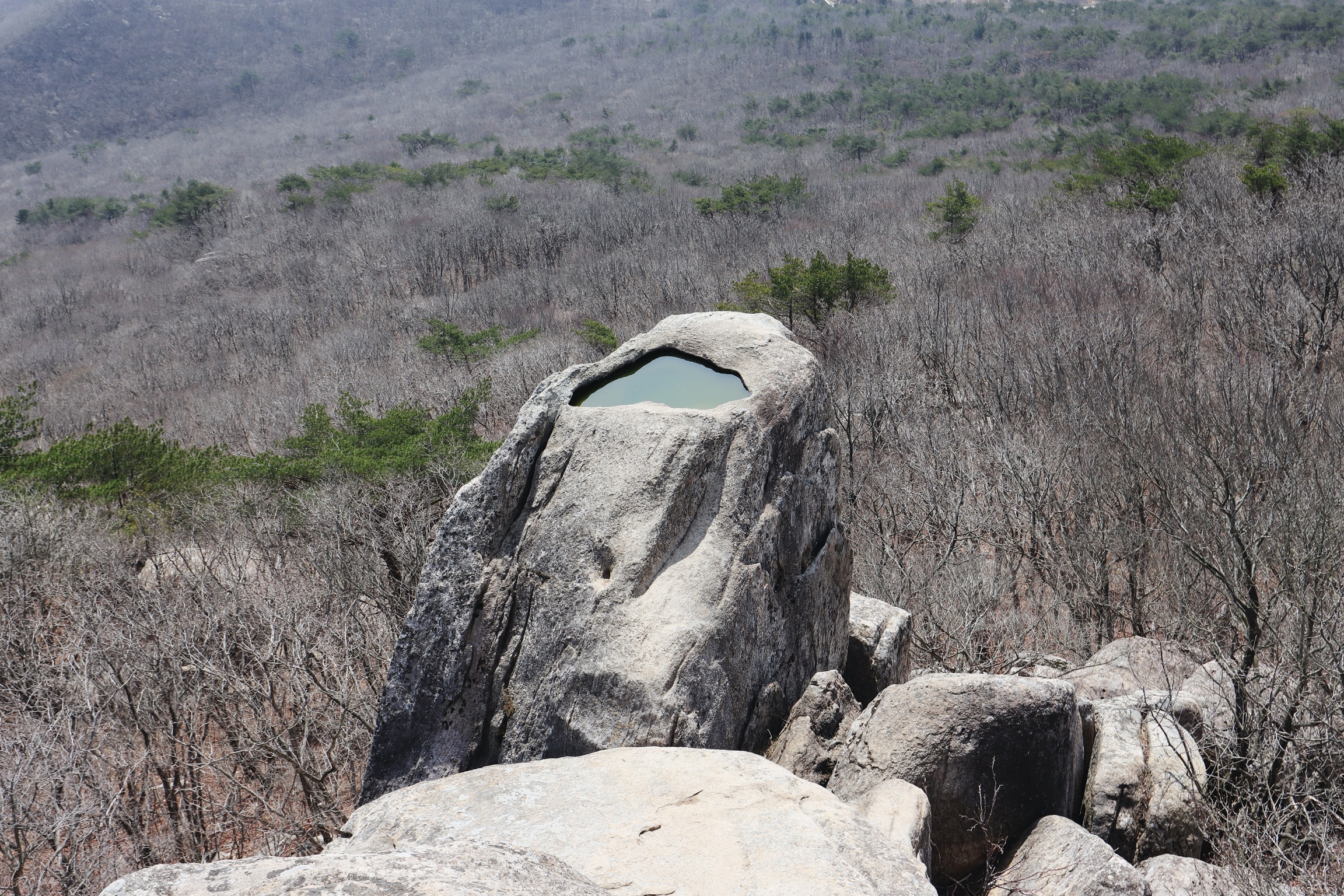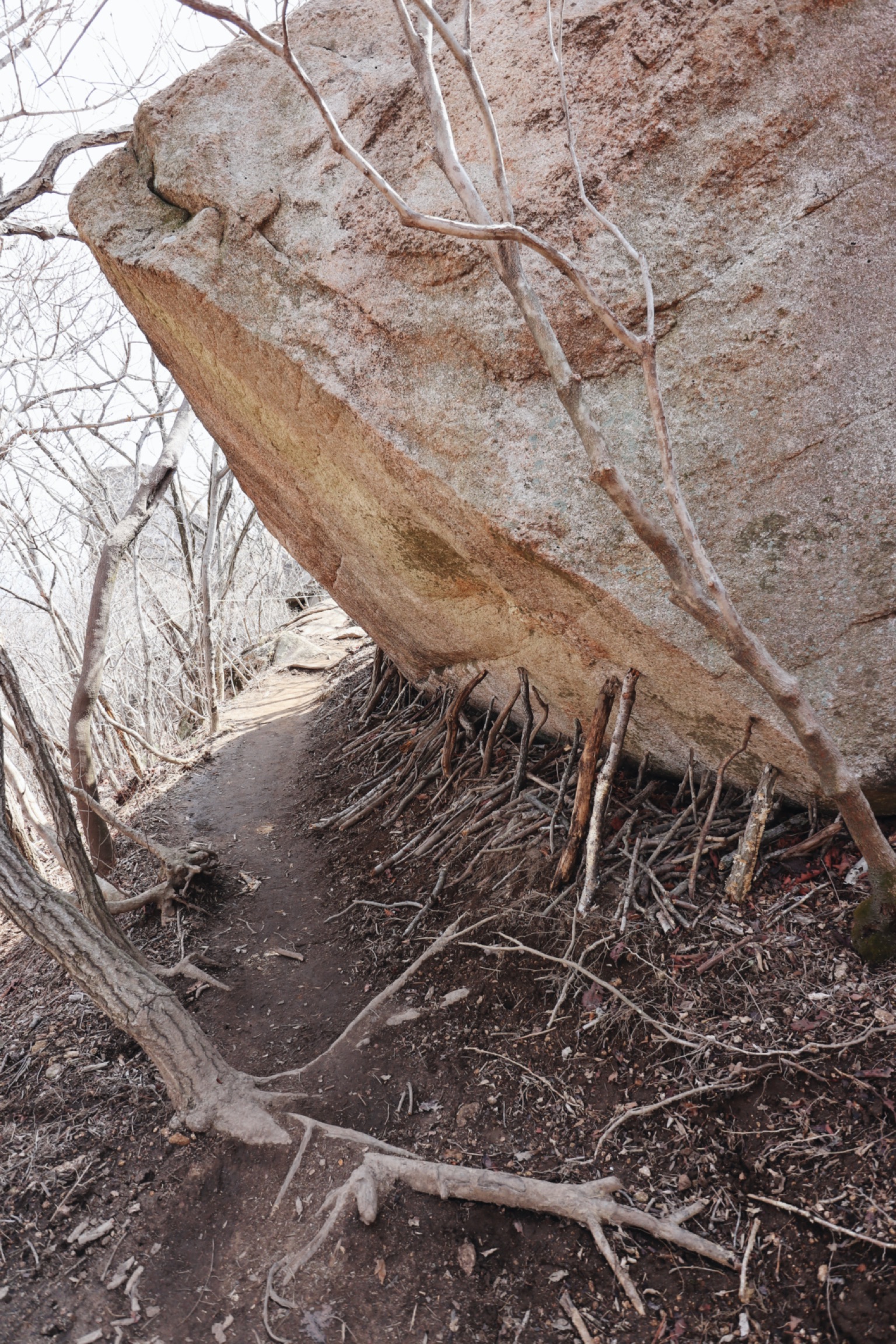 신기한 바위. 밑 부분에 나무들이 꼭 돌은 받쳐 들고 있는 듯한 형상이다.