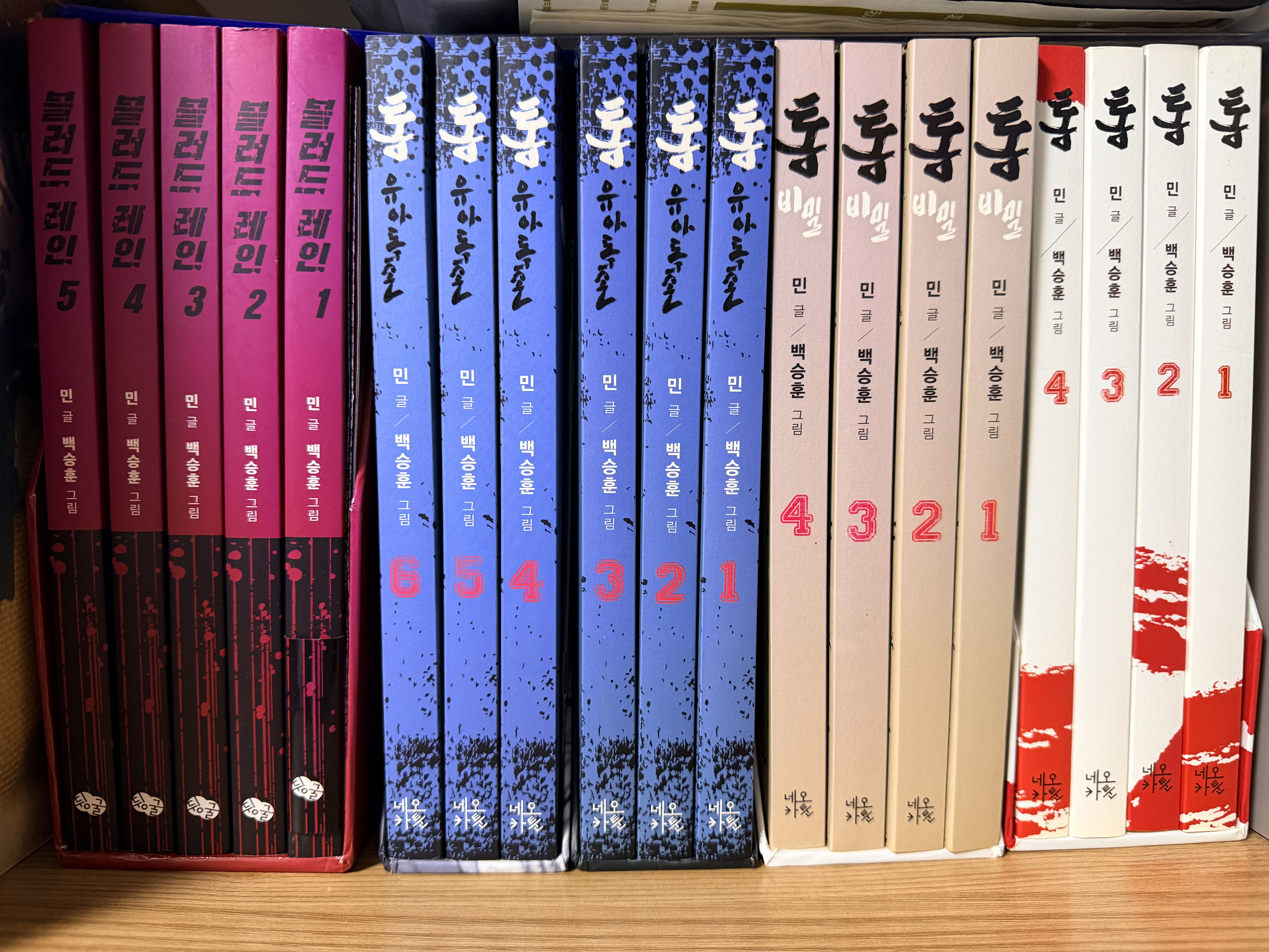 '통'을 시작으로 전부 모아보려 했지만 책값이 만만찮아서 '블러드레인 1'에서 그만 멈추고 말았던 민, 백두 작가의 작품들.