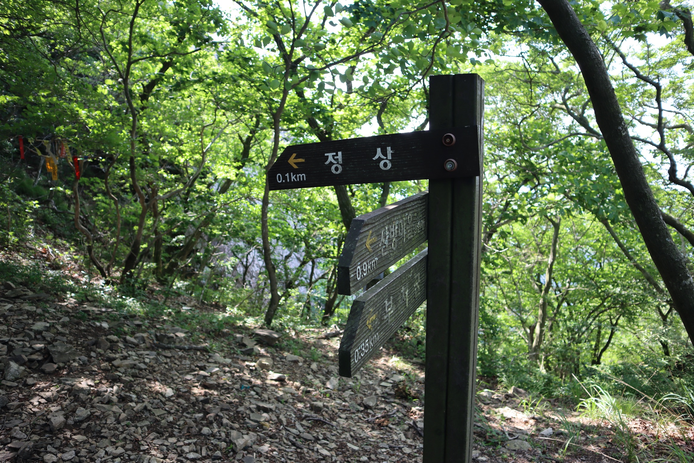 가파른 돌길들이 계속 이어지다 나타난 이정표와 무지개터 푯말. 정상까지 100m 남았다.
