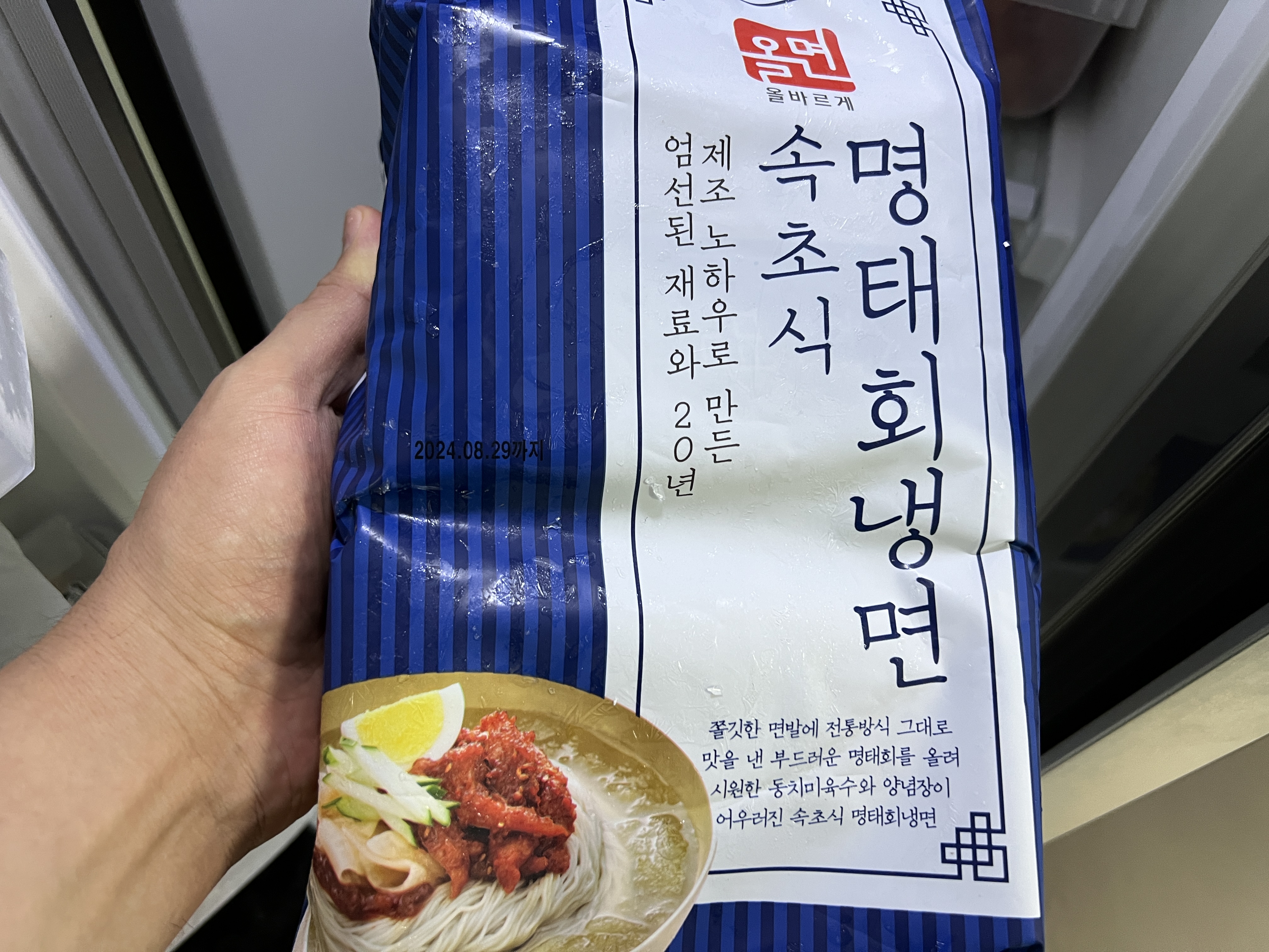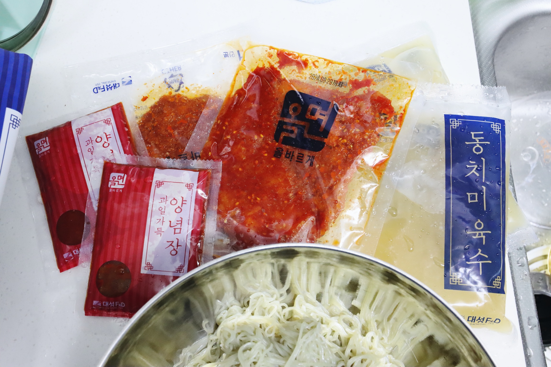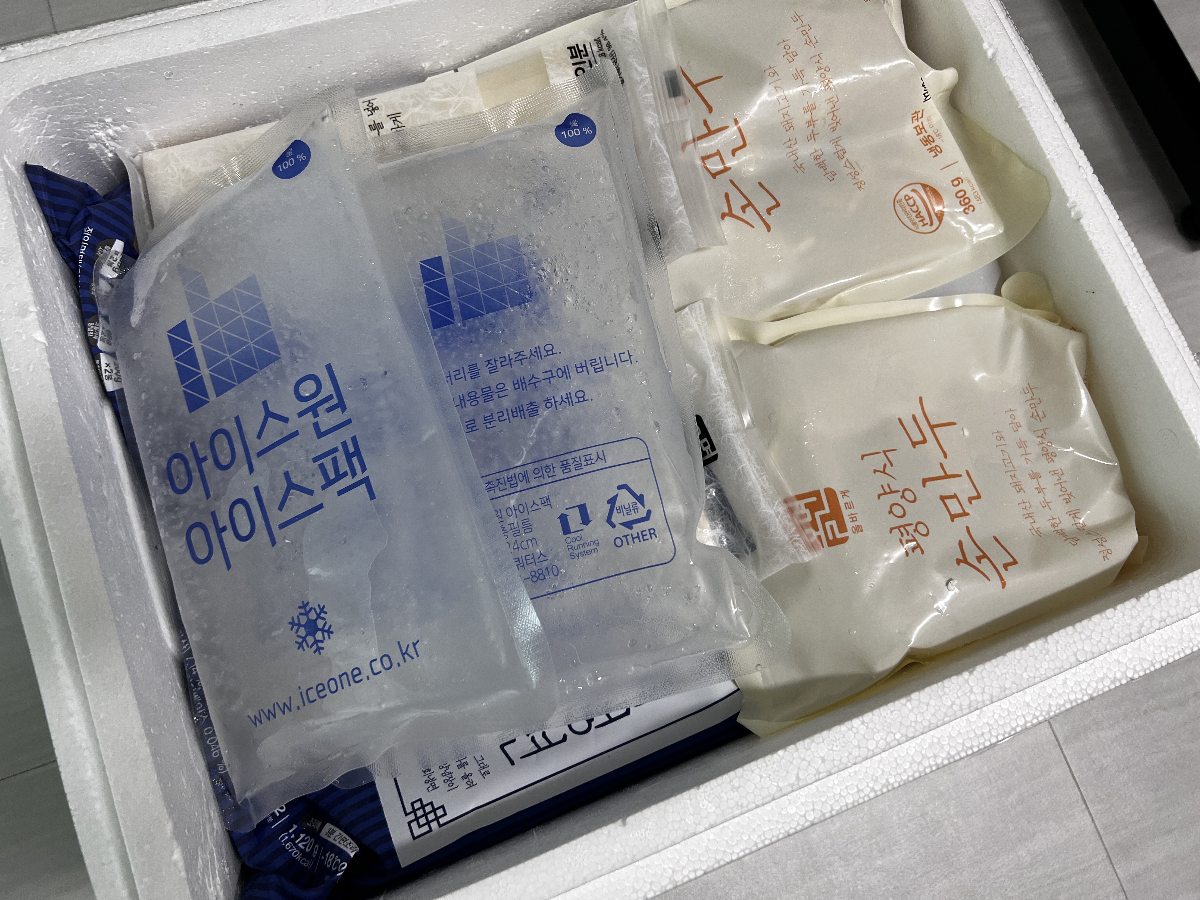 면은 냉동 상태에서 4분 30초가량 끓는 물에 삶으라 했는데 조금 더 짧게 해도 되고 냉동된 육수는 흐르는 물에 그대로 해동해서 바로 시식 가능.