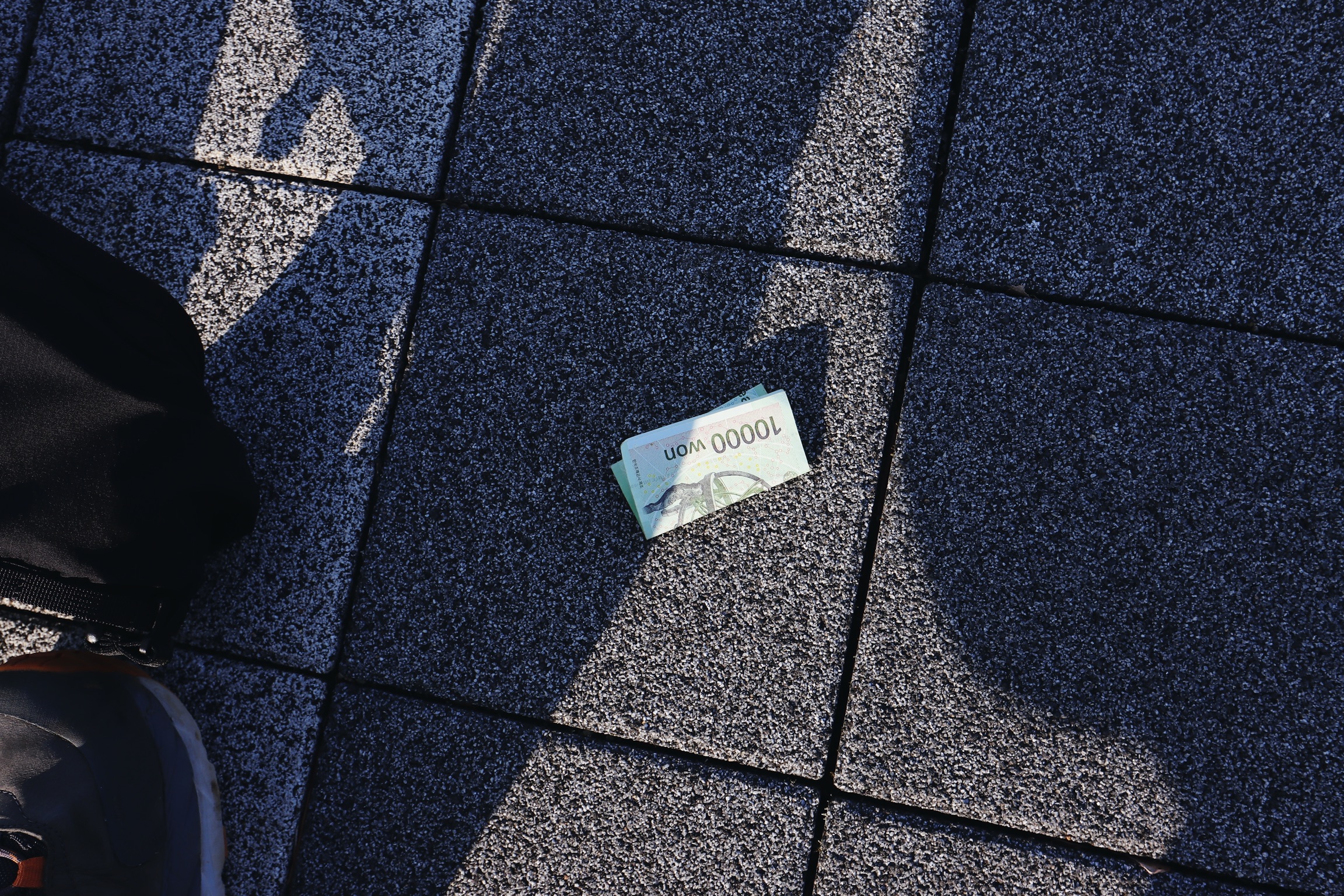 뒤늦은 누나를 기다리며 벤치에 앉으려고 보니 땅이 떡하니 만 원짜리가 떨어져 있다. ㅎㅎ 착한 일에 대한 보상인가?