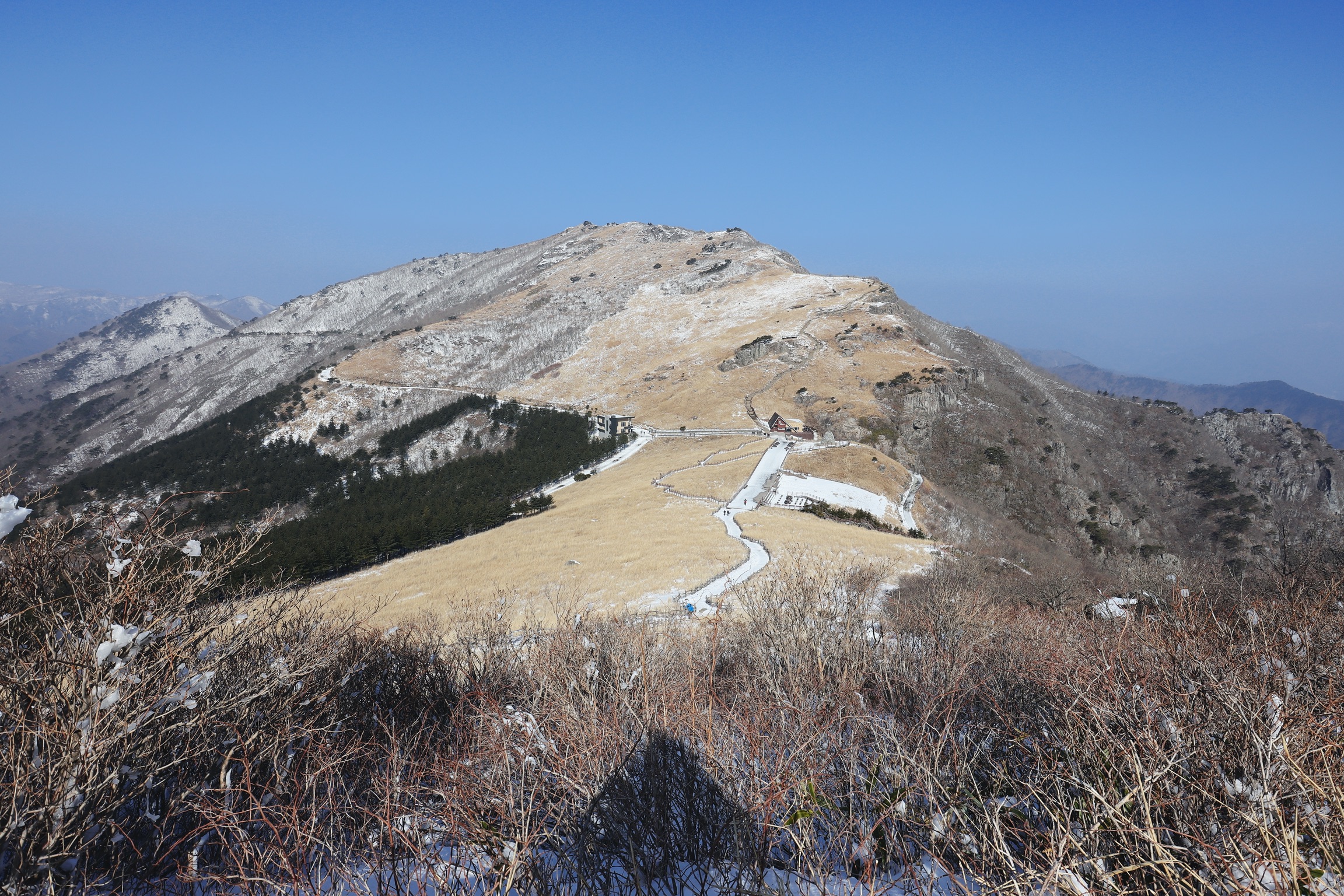 멀리 산능성이에 눈이 보인다.