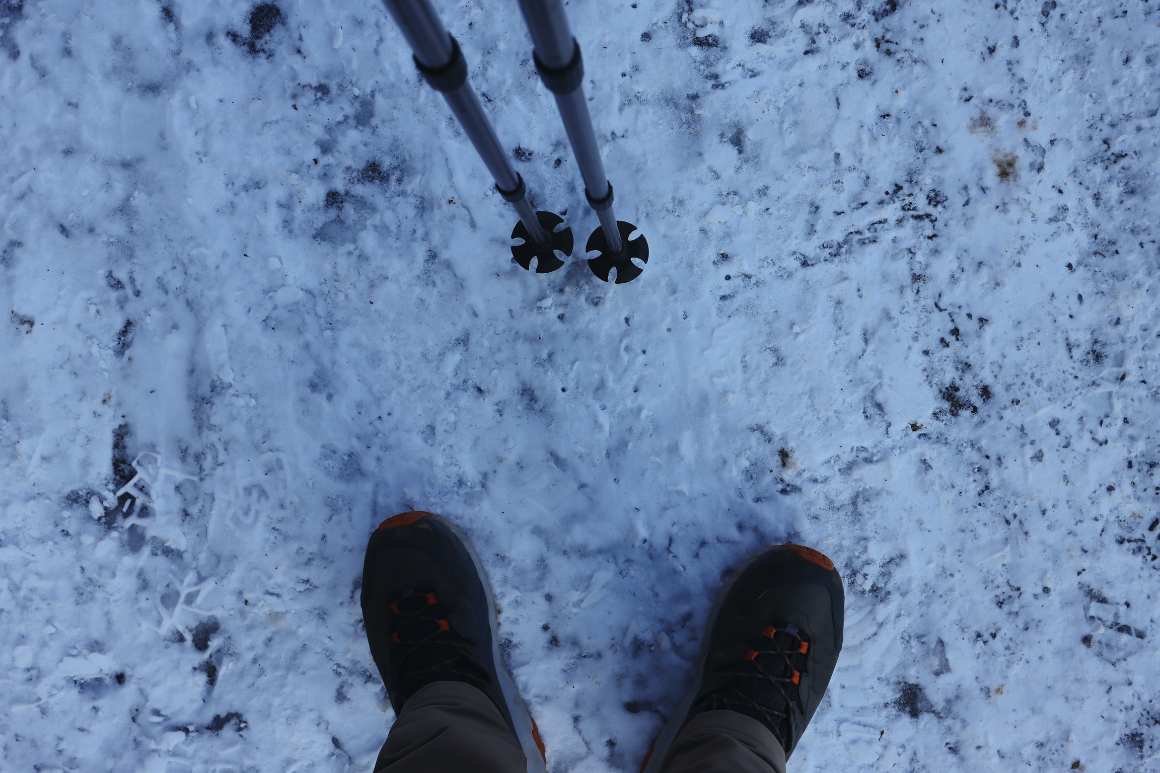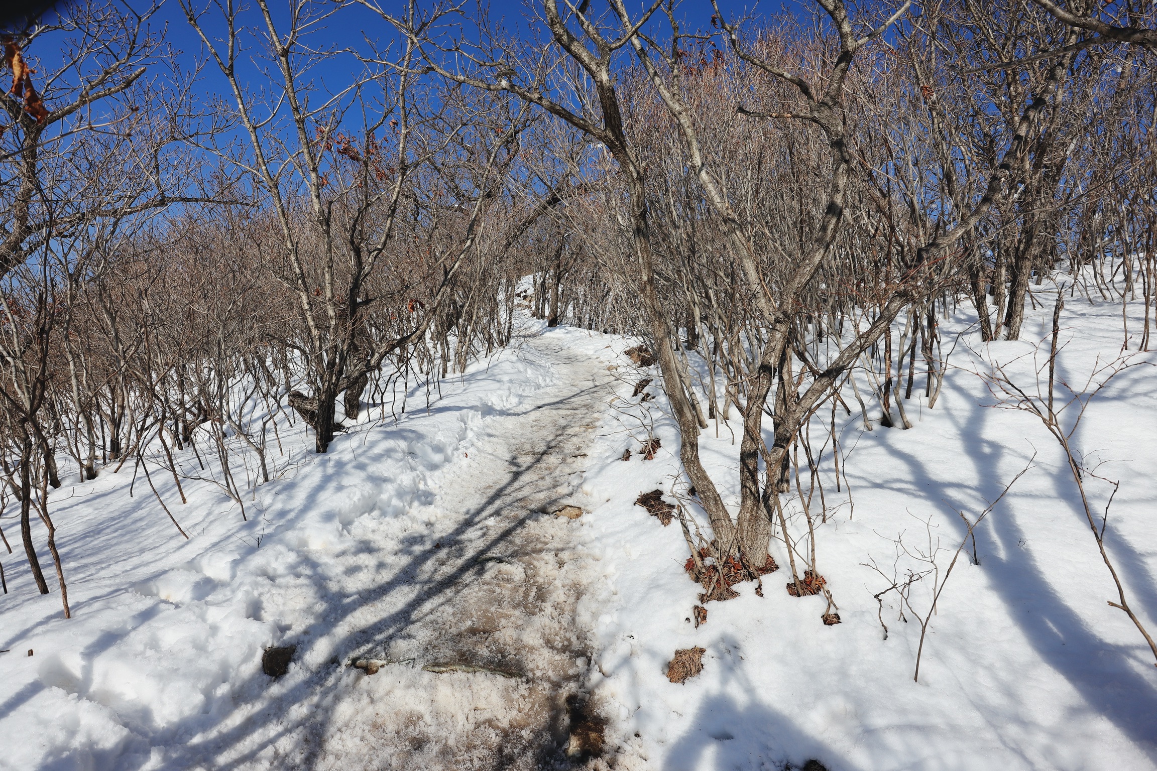 눈이 녹은 곳은 얼음으로 변해있고 아이젠이 필요한데 꺼내기는 영 귀찮음. 올라가서 차야겠다. ㅎ