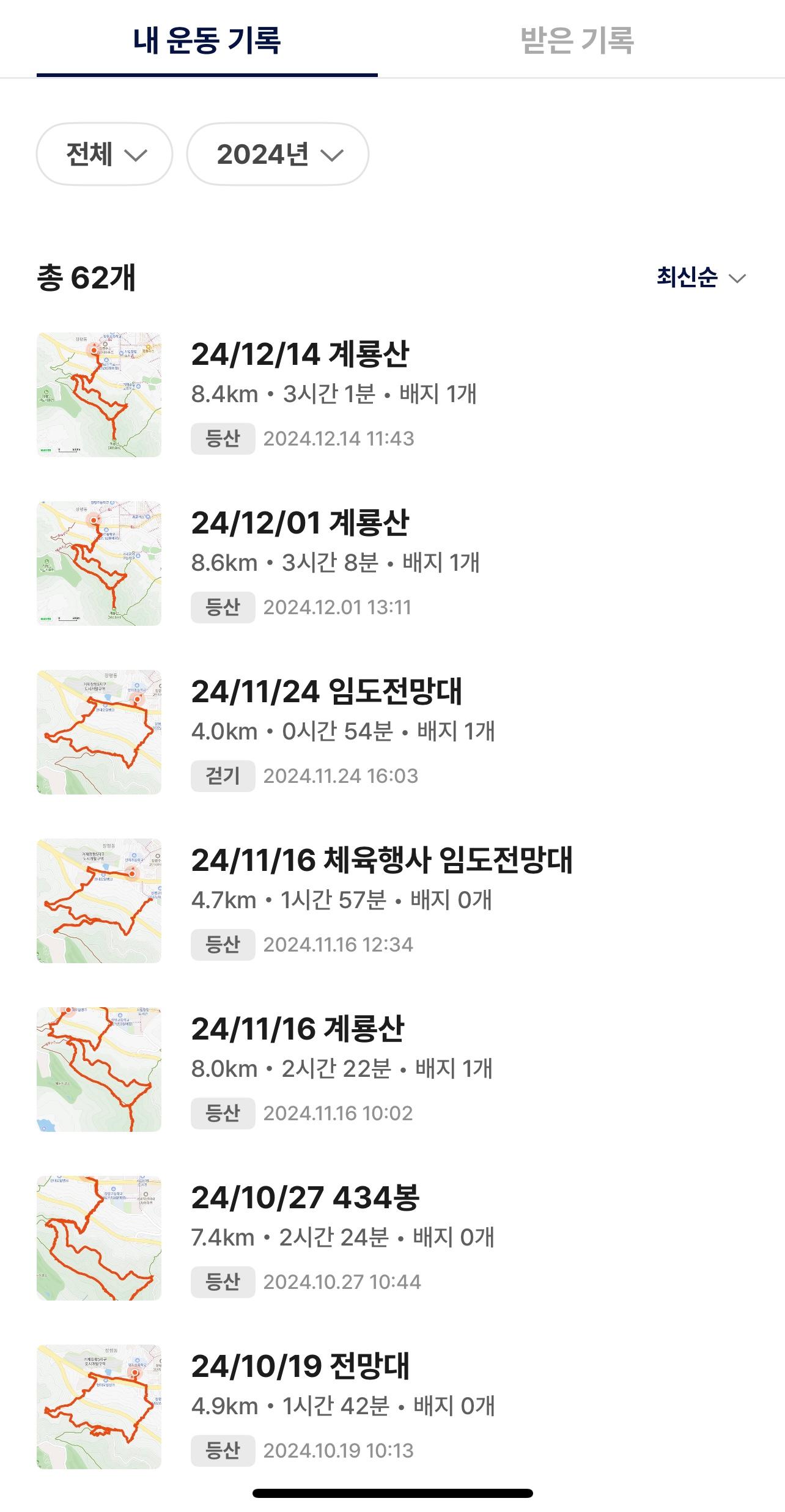 올해 합계를 보니 총 62회, 19개의 산을 올랐다.