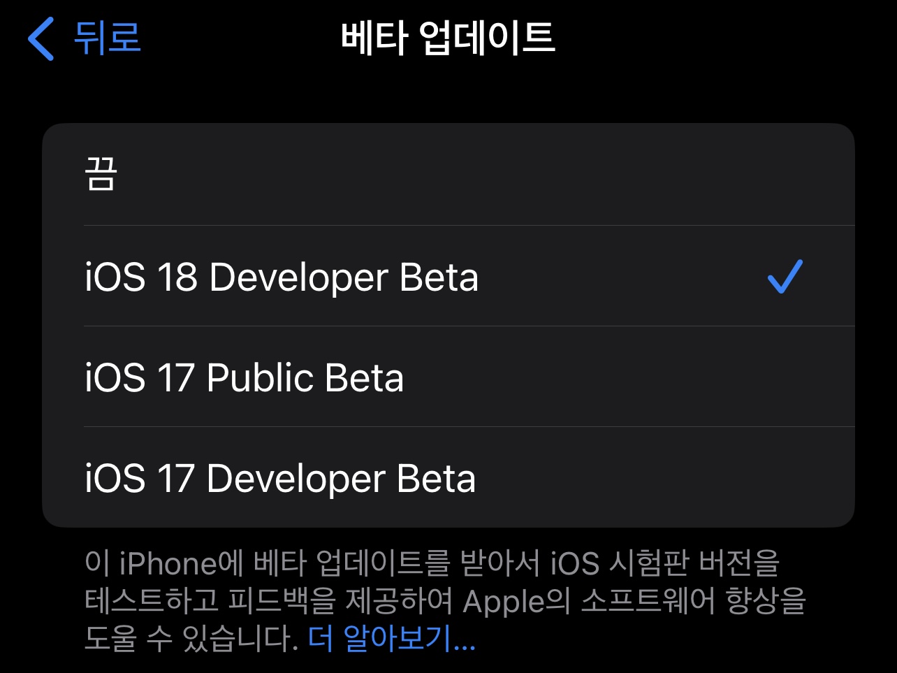혹시나 해서 업데이트에 들어가서 보니 역시나 개발자 버전이 올라와 있다.